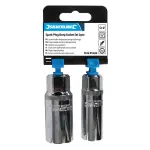 Hardened chrome vanadium spark plug sockets with chamfered ends and rubber inserts for secure plug retention. 3/8” drive.