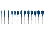 Bosch EXPERT 13-piece spade drill bit set for fast, efficient drilling in softwood. Ideal for electricians and builders.