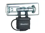 Secured 110mm Master Lock bolt hasp with integrated lock, hardened steel & tamper-proof hinges. Ideal for gates, sheds & fences.