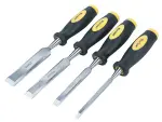 Juego de 4 cinceles para madera de acero forjado con mangos bicolor ergonómicos. Ideal para profesionales y aficionados.
