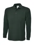 Camiseta Polo Unisex Uneek de manga larga, 50% algodón 50% poliéster, color verde botella. Lavable a 60°C.