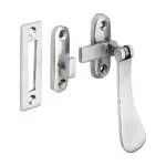 Fermoir à crochet Timco en laiton massif chromé satiné pour fenêtres à battants. Design réversible et installation facile.