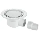 Siphon de sol McAlpine TSG50WH (50mm) pour salles d'eau, avec joint hydraulique anti-odeurs et sortie horizontale. Idéal pour sols en vinyle.