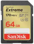 SanDisk Extreme SDXC UHS-I U3 cárta 64GB le luas léimh 170MB/s. Insheasamh i gcoinne teochta, uisce, turraing agus X-ghathanna. Iontaofa do ghairmithe.