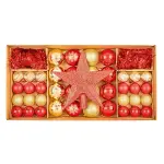 Sraith maisiúcháin Nollag Premier le baubles neamhbriste, barrchrann réalta, agus décor dhearg & ór. Foirfe don Nollaig.