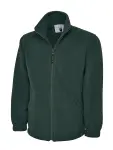 De Uneek Classic Fleece Jacket in flessengroen (maat S) biedt warmte en stijl met dubbele stiknaden en ritszakken. Perfect voor elke dag.