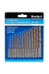 Blue Spot 13-piece titanium-coated drill bit set for wood, metal, and plastics. Hex fitting for power tools, sizes 1.5-6.5mm.