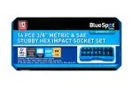 Blue Spot Tools 3/8英寸16件套短型冲击套筒组,含8公制8英制尺寸,采用铬钼合金钢与黑色磷化涂层提供强大耐腐蚀能力,适用于汽车维修和机械装配。
