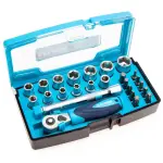 Eclipse ESS34PS 34件套筒組,含1/4及3/8吋方頭套筒、鑽頭及配件,採用鉻釩鋼材質,72齒棘輪手柄,適合汽修及DIY使用。
